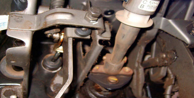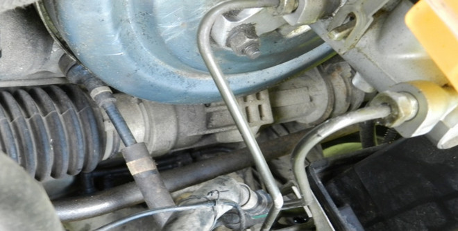 Второй вариант подтяжки рейки более удобный, но и более трудоёмкий. В этом случае для регулировки мы будем снимать вакуумный усилитель тормозов. Со снятым вакуумным усилителем тормозов открывается доступ к рейку сверху.