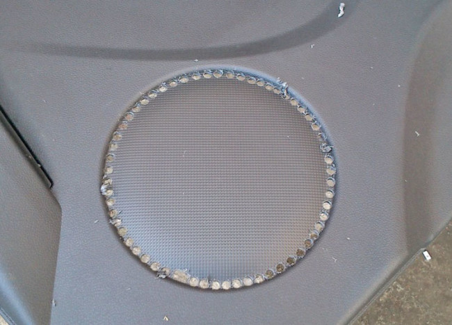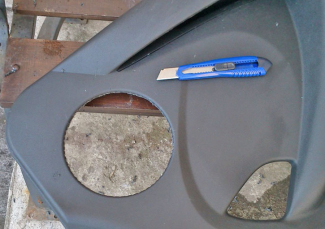 - В облицовочной обшивке создается отверстие под музыкальное оборудование. Для акустики 13 размера уже создана железная ниша. Именно туда вставляется задняя часть динамиков. Иногда требуется небольшая подпилка электролобзиком.